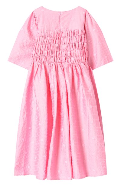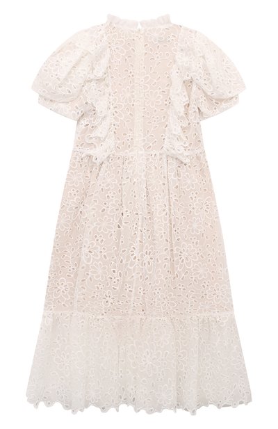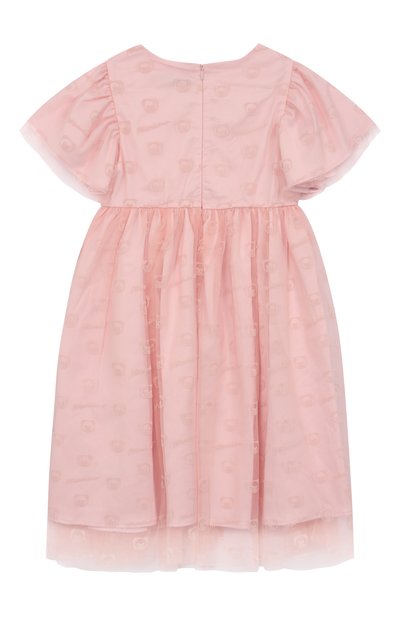 Платье с брендированным флокированным принтом выполнили из тюля, предусмотрев подклад. Модель с короткими рукавами-крылышками и драпированным подолом застегивается потайной молнией сзади.
