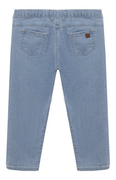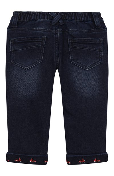 Джинсы с эластичным поясом выполнили из хлопкового денима. Спереди модель украсили аппликацией в виде фирменного медвежонка Teddy Bear, а один из пяти карманов изделия дополнили вышитым логотипом бренда.