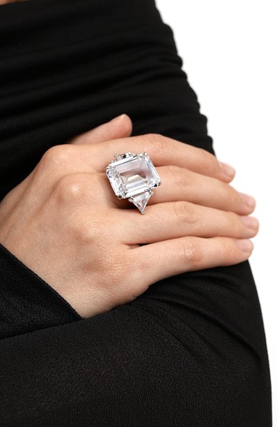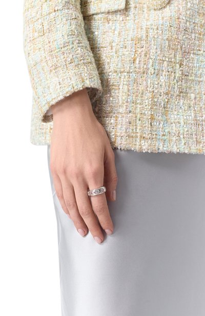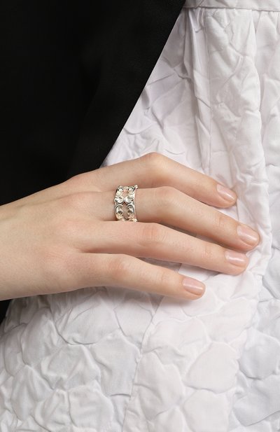 Массивное кольцо Folded Ring выполнили из латуни с гальваническим покрытием серебром. Объемную складку аксессуара подчеркнули кристальным паве.