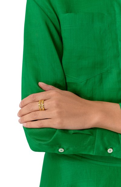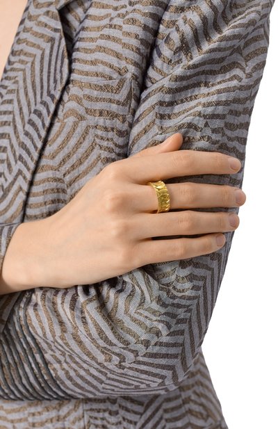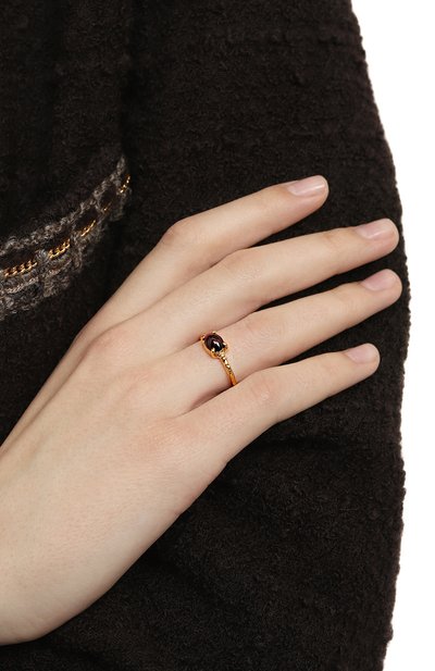 Разомкнутое кольцо Safety Chain из латуни покрыли тонким слоем 12-каратного золота. Украшение с выгравированным логотипом марки и кристаллом на внутренней стороне дополнили тонкой цепочкой с карабином.