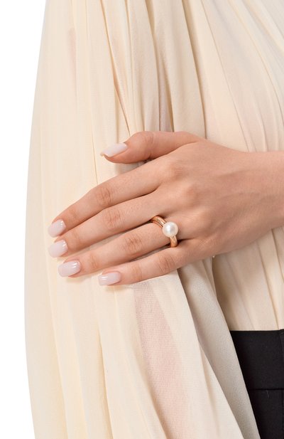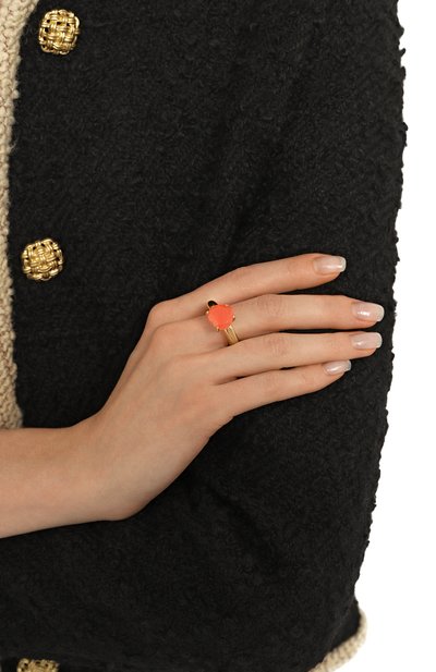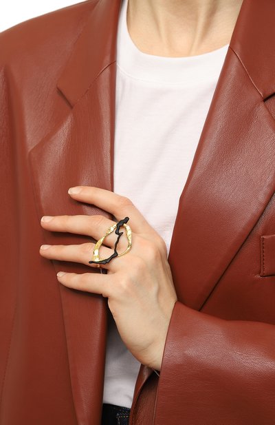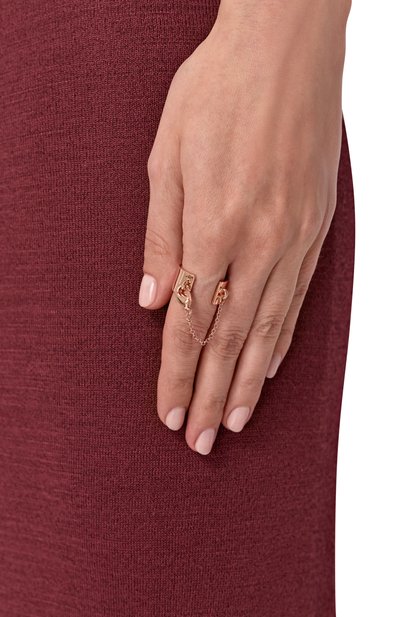 Кольцо на три пальца изготовили вручную из латуни с покрытием 12-каратным золотом. Украшение с выгравированными логотипами марки внутри дополнили двумя тонкими цепочками.