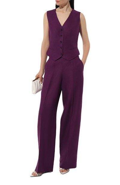Расклешенные брюки длины 7/8 выполнили из шерстяного габардина, прошив стрелки. Модель с двумя карманами по бокам дополнили двумя листочками сзади, одну из которых украсили фирменной пластиной.