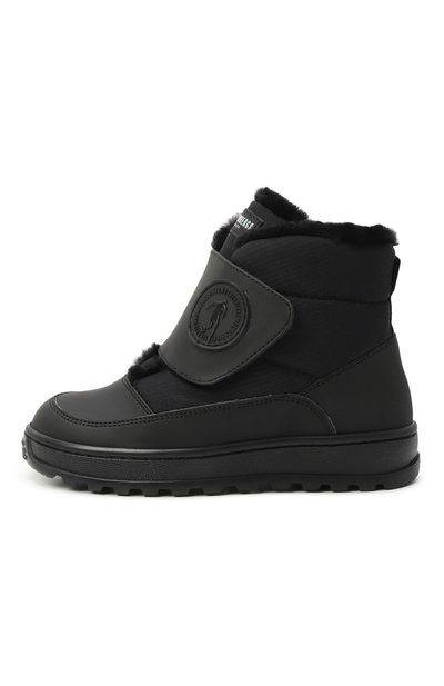 Ботинки, утепленные овчиной, выполнили из комбинации матовой кожи и непромокаемого текстиля. Модель с двумя ремешками-велкро и протекторной подошвой украсили вставкой с логотипами марки.