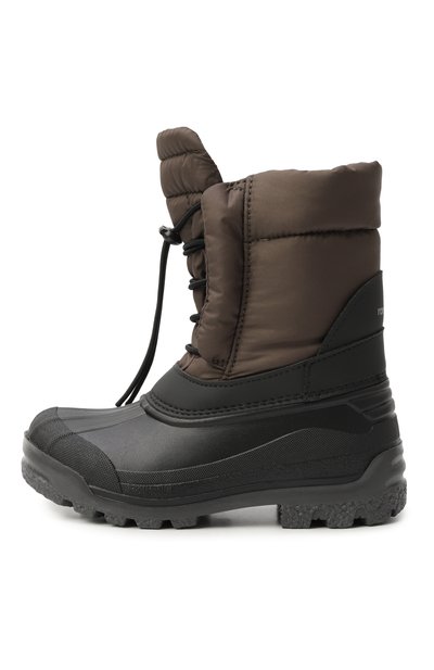 Ботинки на акцентной рифленой подошве выполнили из кожи и текстиля с полимерным покрытием. Внутри модель с застежками велкро отделали контрастной овчиной. Сбоку пару украсили фирменной эмблемой, а на язычке – брендированным патчем.