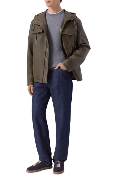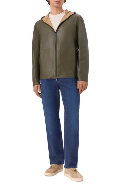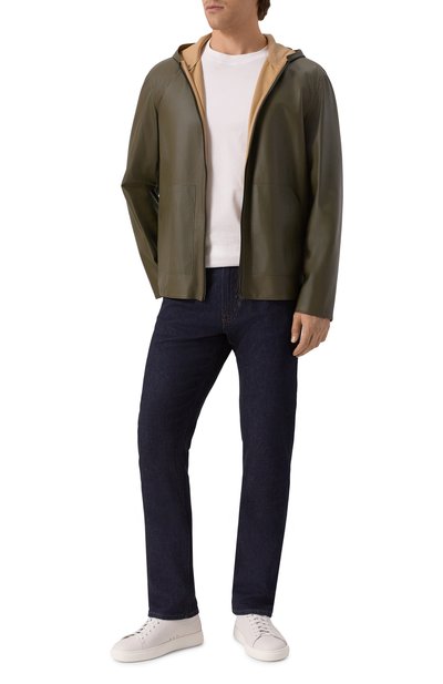 Для создания куртки со съемным регулируемым капюшоном выбрали мелкозернистую кожу. По бокам предусмотрели врезные карманы с листочками. Модель с наполнителем Thindown и подкладом из чистого шелка застегивается кнопками в тон.