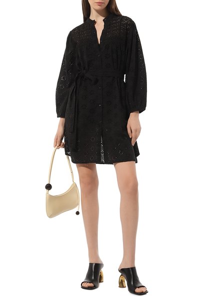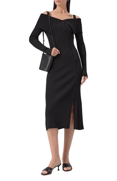 Миди-платье с вертикальным воланом сбоку и съемной брошью-цветком выполнили из вискозы. Модель застегивается потайной молнией сзади с пуллером в виде эмблемы марки.