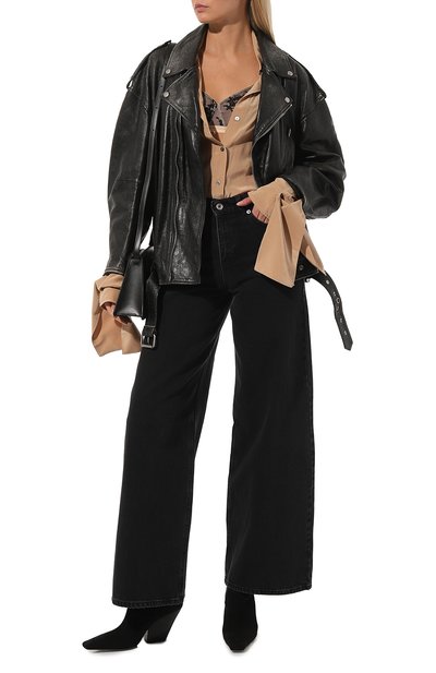 Широкие джинсы Slouchy с двумя парами карманов выполнили из неэластичного денима. Модель с потертостями, формирующими зигзаг, декорировали россыпью граненых стразов.