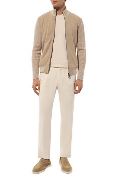 Кардиган с рукавами реглан, воротником-стойкой и поясом в рубчик выполнили из шерсти. Модель с парой боковых карманов застегивается встречной молнией.