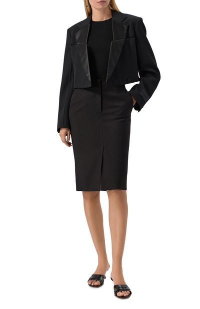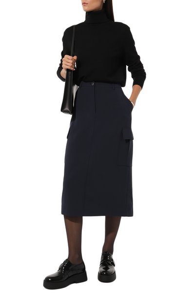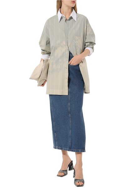 Джинсовую миди-юбку с высокими шлицами спереди и сзад и сшили из хлопкового денима с добавлением лиоцелла. Пояс со шлевками украсили брендированным патчем. Модель дополнили двумя врезными карманами.