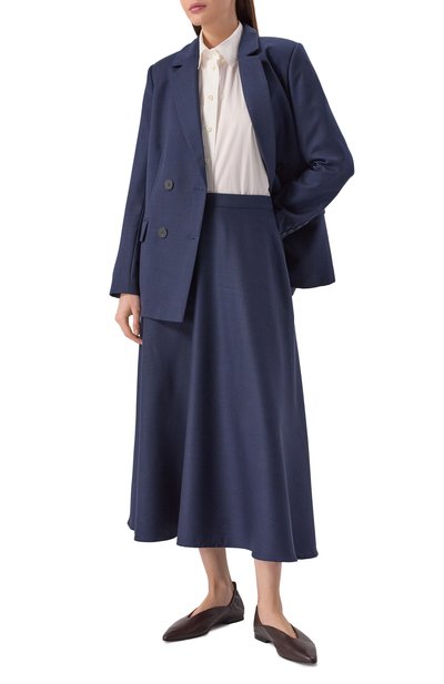 Джинсовую миди-юбку с высокими шлицами спереди и сзади сшили из хлопкового денима с добавлением лиоцелла. Пояс со шлевками украсили брендированным патчем. Модель дополнили двумя врезными карманами.