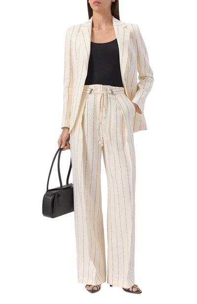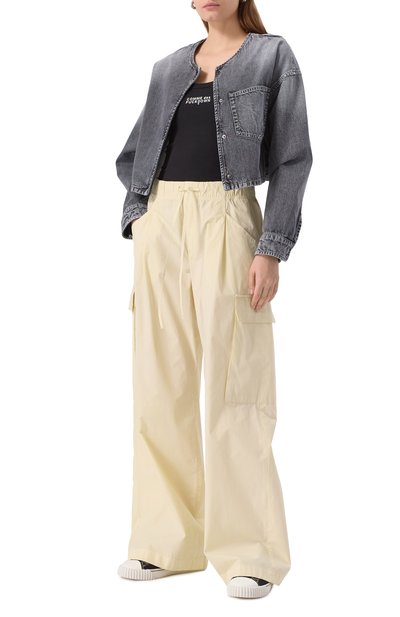Брюки свободного кроя выполнили из стрейчевого хлопкового вельвета с добавлением полиамида. Модель с завышенной талией дополнили боковыми и задними карманами.