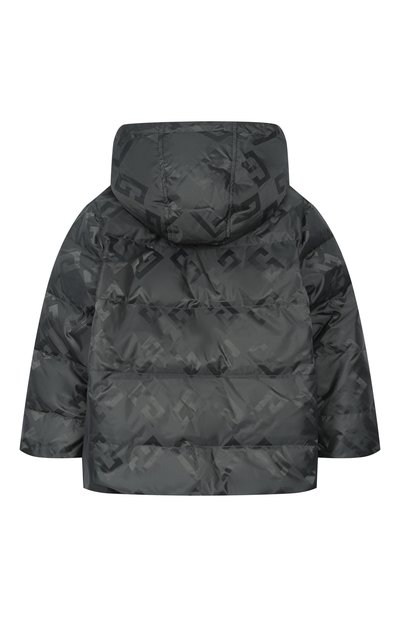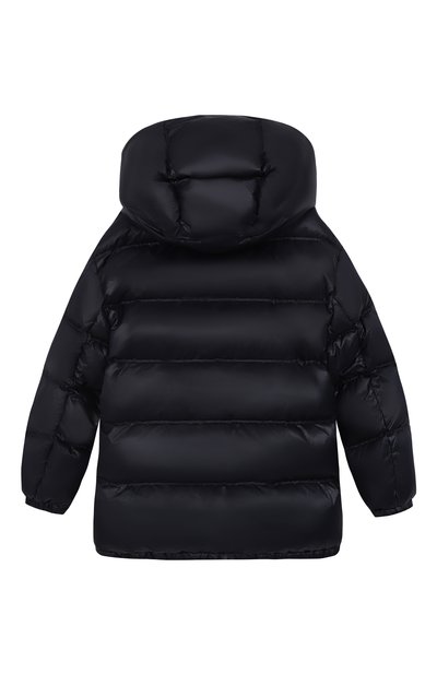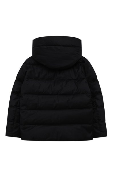Стеганый пуховик с капюшоном и боковыми карманами изготовили из шерстяной ткани с небольшим добавлением шелка. Модель на утином пуху утеплили внутренней отделкой из меха европейского кролика.