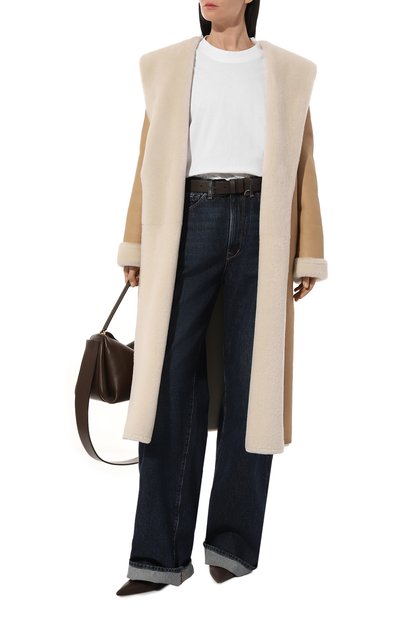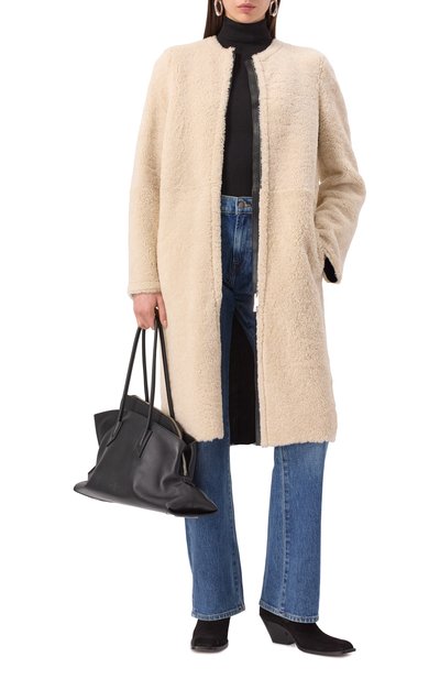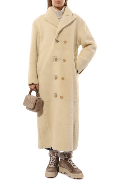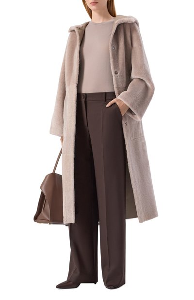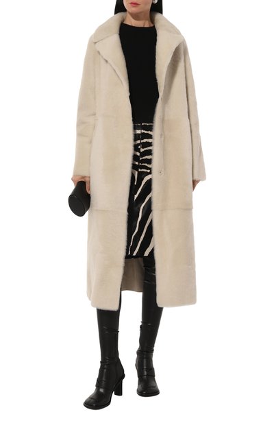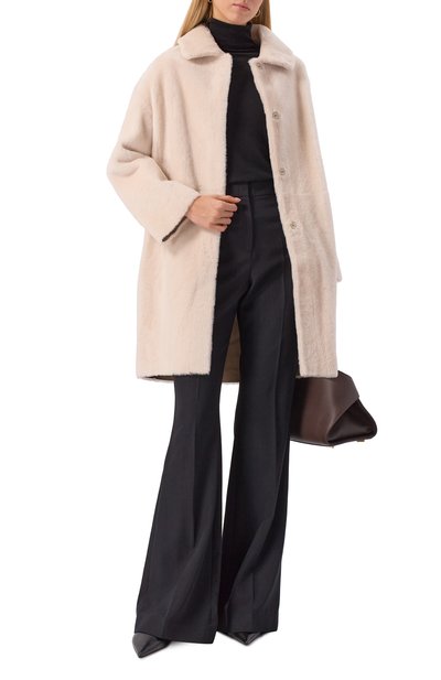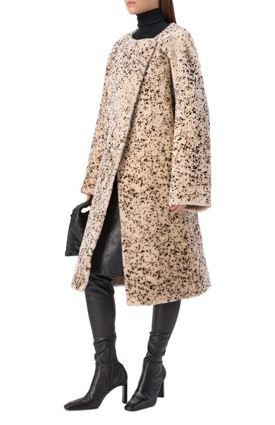 Двустороннюю дубленку прямого кроя сшили из овчины с фактурной лицевой частью и гладкой матовой изнанкой. Модель с врезными боковыми карманами и поясом-лентой застегивается потайными кнопками.