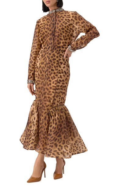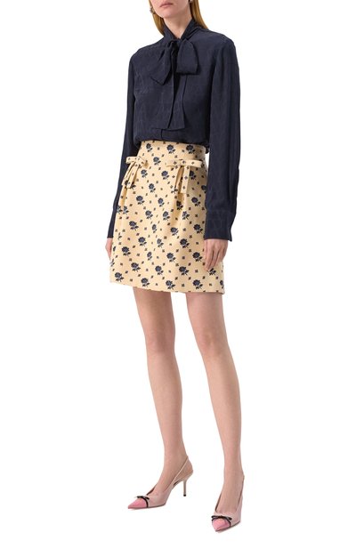 Юбку с леопардовым мотивом и однотонной фактурной каймой по краю украсили атласными бантами на накладных карманах. Модель из креп-кутюра на основе шерсти и шелка застегивается потайной молнией сзади.