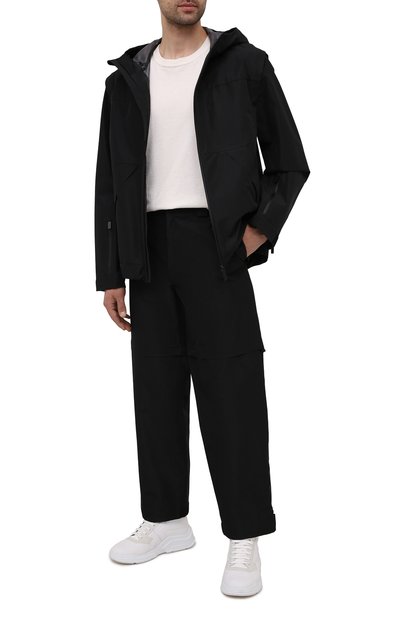 Широкие брюки с двумя карманами и контрастными вставками по бокам сшили из полиэстера. Модель с эластичным поясом декоративно состарили при помощи потертостей. Спереди изделие украсили логотипом марки.