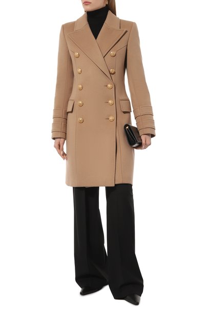 Двубортное пальто Cosa с акцентированной линией плеч, заостренными лацканами и шлицей сзади дополнили двумя карманами с клапанами. Модель на атласном подкладе выполнили из верблюжьей шерсти.