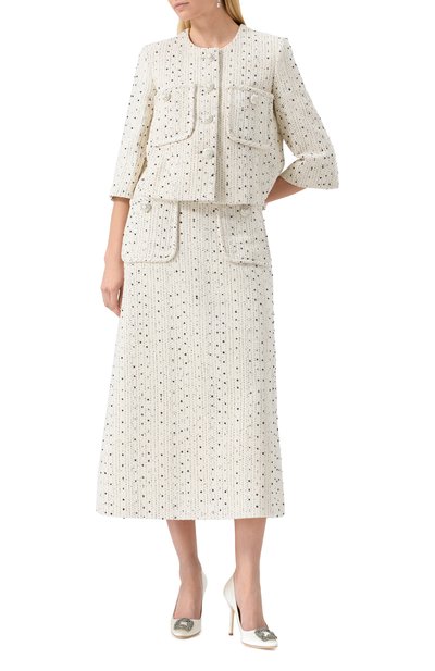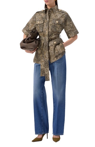 Рубашку с рукавами 3/4 и фигурным низом сшили из жатого хлопкового поплина с добавлением металлизированных волокон. Модель с погонами и нагрудными накладными карманами украсили фирменными нашивками на спинке.