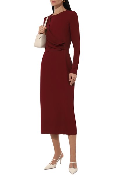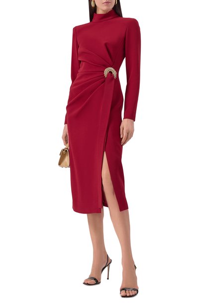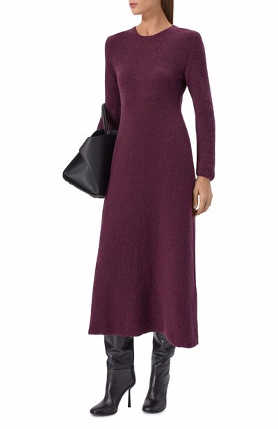 Облегающее платье выполнили из тонкого шерстяного трикотажа. Лаконичную модель дополнили высокой горловиной, край которой слегка закручивается.