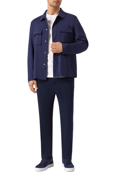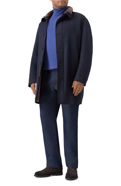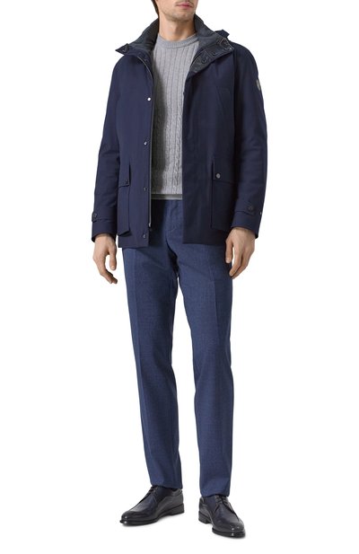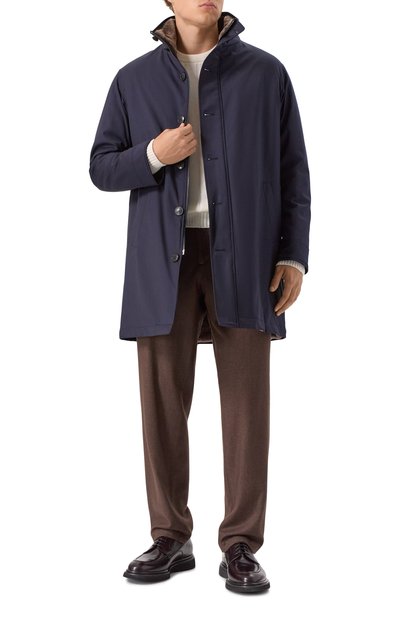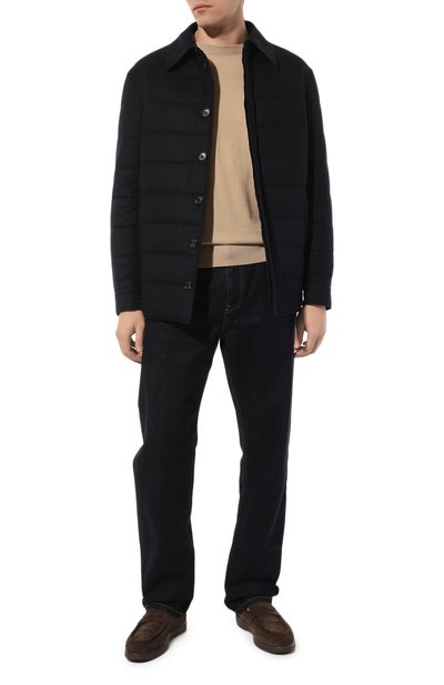Клетчатую куртку-рубашку прямого кроя сшили из микса кашемира и шелка. Рукава и кокетку отделали кожей. Трикотажная вставка с воротником-стойкой застегивается молнией, а сама модель – брендированными кнопками.