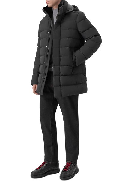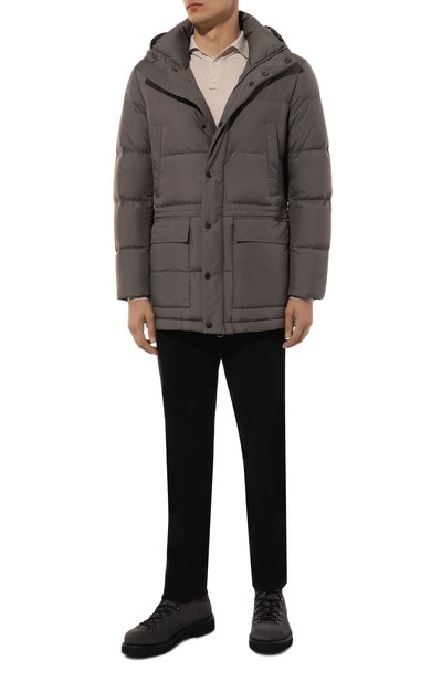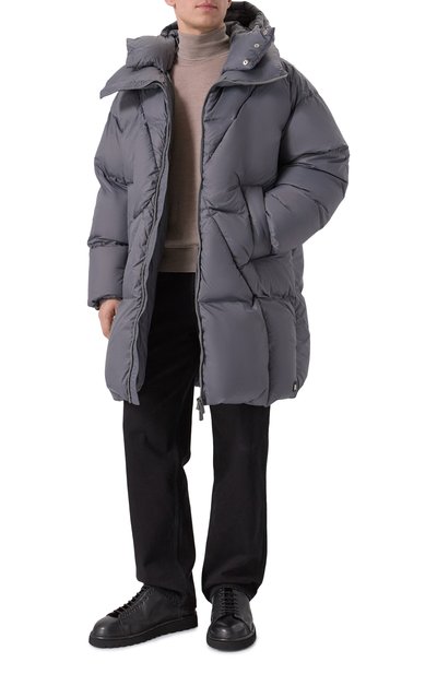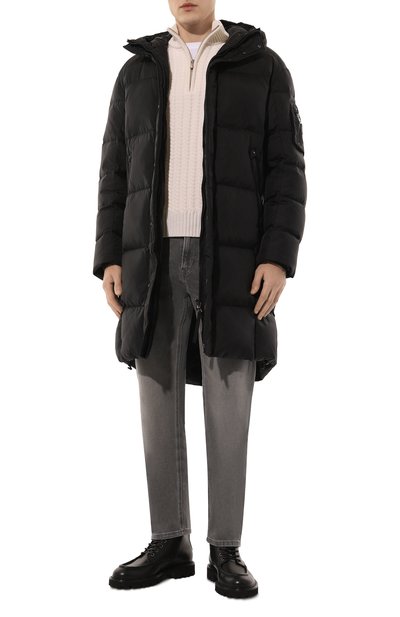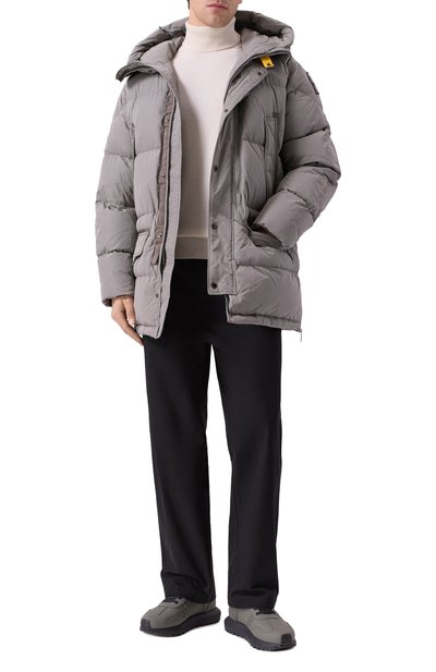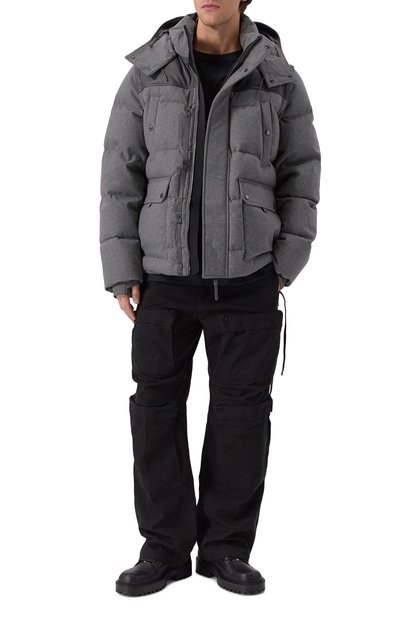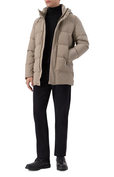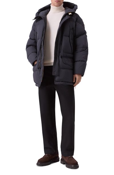 Стеганую парку Long Bear на утином пуху выполнили из влагоотталкивающих полиэстерового микрорепса и нейлонового оксфорда. Модель с эластичными манжетами, разрезами с молниями по бокам и регулируемым капюшоном с фирменным ремешком на кнопке дополнили нагрудными карманами, накладными боковыми с клапанами и тремя внутренними.