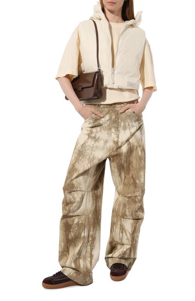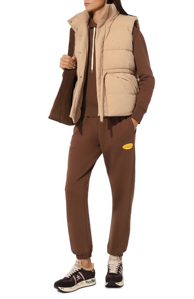 Стеганый жилет Nolene на утином пуху выполнили из влаго- и ветронепроницаемого нейлонового репса. Модель с боковыми карманами на молниях и внутренним на липучке декорировали брендированным патчем на высоком воротнике-стойке с регулируемой кулиской и фирменным ремешком с кнопкой.