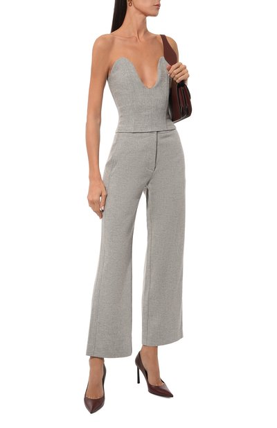 Бюстье с застежкой сзади выполнили из слегка эластичной полушерстяной ткани с добавлением полиэстера и вискозы. Чашечки модели украсили тюлем с вышивкой в тон.