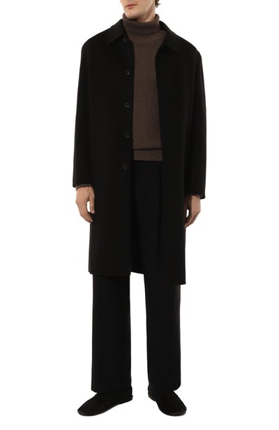 Пальто с хлопковым подкладом выполнили из фактурной шерсти с добавлением нейлона и полиэстера. Модель со спущенной линией плеч дополнили двумя боковыми карманами.