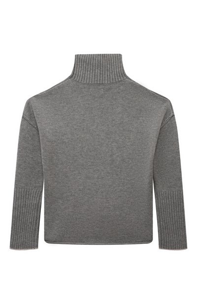 Свитер с манжетами и поясом в рубчик связали арановым узором из хлопковой пряжи с добавлением кашемира. Спереди и на рукавах модель с высоким воротом декорировали разноразмерными стразами.