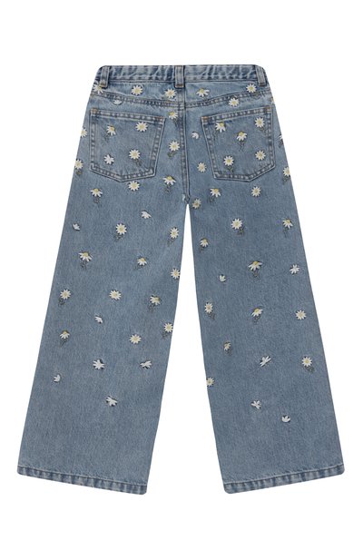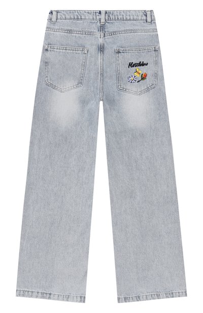 Слегка выбеленные джинсы из хлопкового денима украсили орнаментом из кристаллов разных огранок. Модель дополнили пятью карманами, а на поясе разместили брендированный патч.