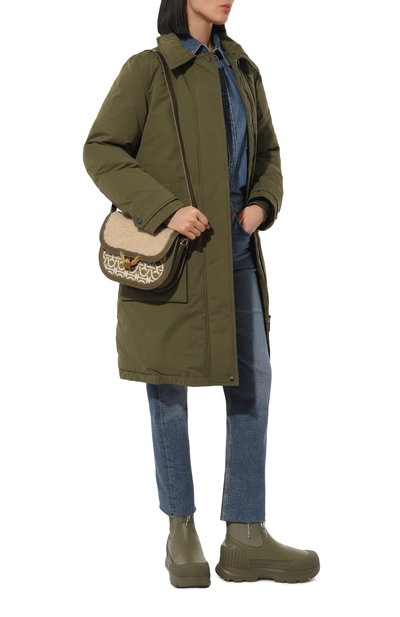 Парку на гусином пуху выполнили из гладкого полиэстера. Модель с отлетной кокеткой, кулиской на талии и накладными боковыми карманами с клапанами дополнили отстегивающимся капюшоном со съемной меховой отделкой и брендированной пластиной.
