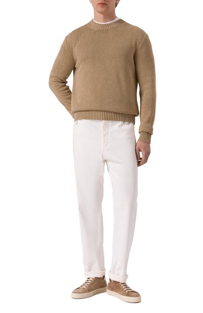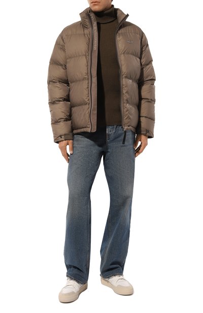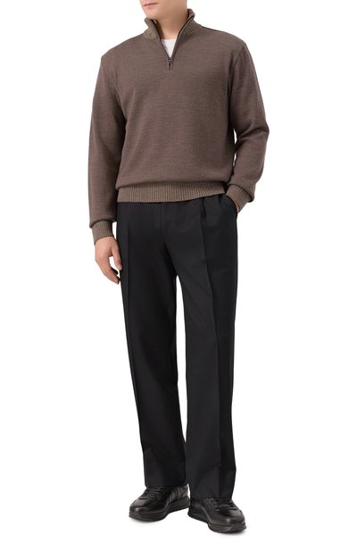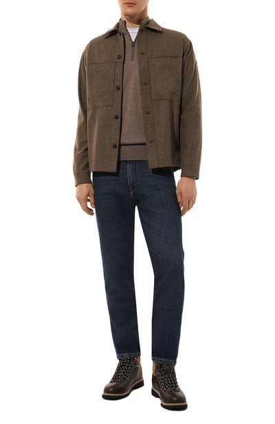 Свитер с круглой горловиной, манжетами и поясом в рубчик связали фактурным узором плотностью пять петель на дюйм из шерсти с добавлением полиамида. Накладной нагрудный карман из влагостойкой ткани Taylon P декорировали вышитым в тон логотипом марки.