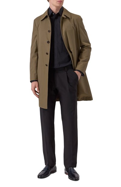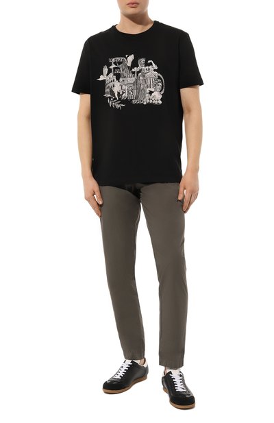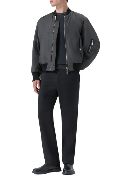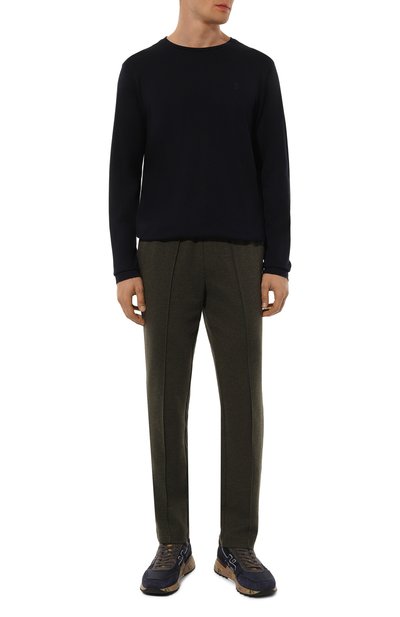 Брюки с тремя карманами и одним карго украсили брендированной нашивкой сзади. Модель из эластичного полушерстяного габардина дополнили имитацией ширинки и поясом с потайной кулиской.