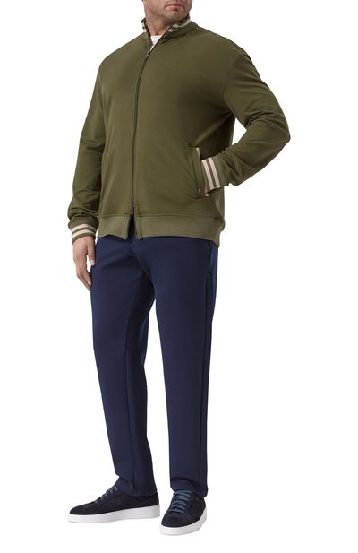 Толстовку с рифлеными манжетами, поясом и воротником-стойкой выполнили из хлопкового футера. Модель с двумя карманами и вышитым логотипом застегивается молнией с брендированным пуллером.