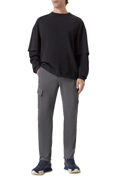 Брюки кроя Regular fit выполнили из хлопкового футера. Модель с потайными кулисками на поясе и внизу дополнили двумя боковыми карманами, накладным сзади и карго с клапаном, украшенным фирменной линзой.