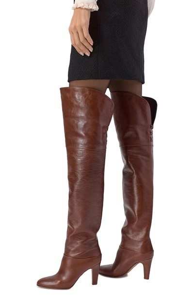 Ботфорты Jessica с широким голенищем, которое слегка драпируется, выполнили из телячьей замши. Модель с зауженным мысом установили на высокий обтяжной каблук.
