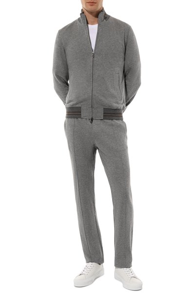 Брюки из хлопкового флиса с добавлением кашемира и полиамида составят комфортный дуэт с парной толстовкой. Модель с простроченными стрелками дополнили тремя карманами, а под эластичным поясом-кулиской закрепили небольшой брендированный патч.