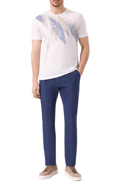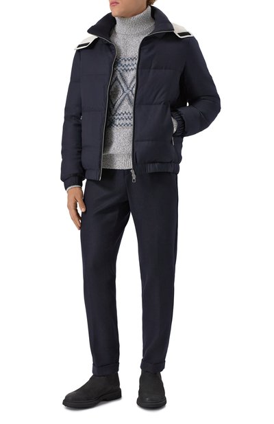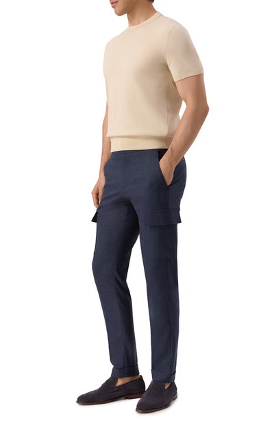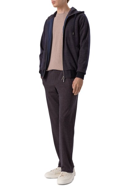 Для создания брюк с прошитыми стрелками и тремя карманами использовали трикотаж на основе хлопка и шерсти, усиленны й полиэстером. Посадка модели регулируется шнурком, продетым в эластичный пояс-кулиску.