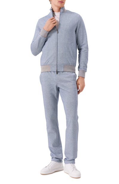 Брюки с эластичным поясом-кулиской и простроченными стрелками выполнили из трикотажа на основе модала, полиамида и кашемира. Помимо боковых карманов предусмотрели задний на пуговице.