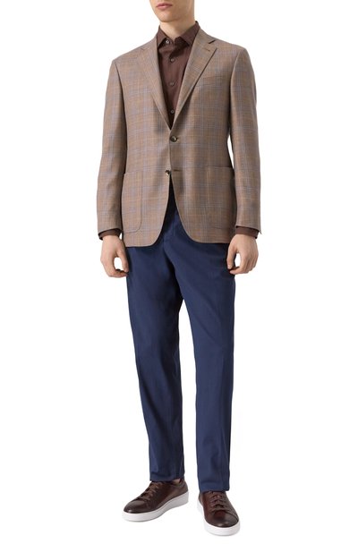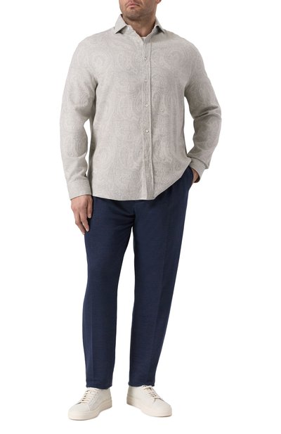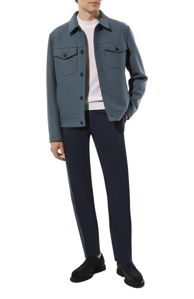 Для пошива брюк прямого кроя использовали шерстяную фланель с добавлением кашемира. Модель с регулируемой кулиской на эластичном поясе дополнили боковыми и задними карманами.