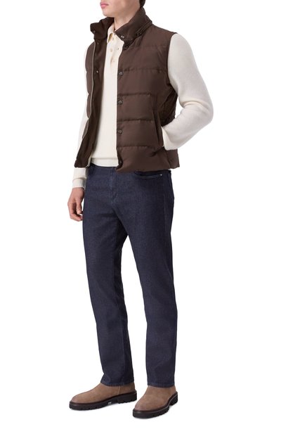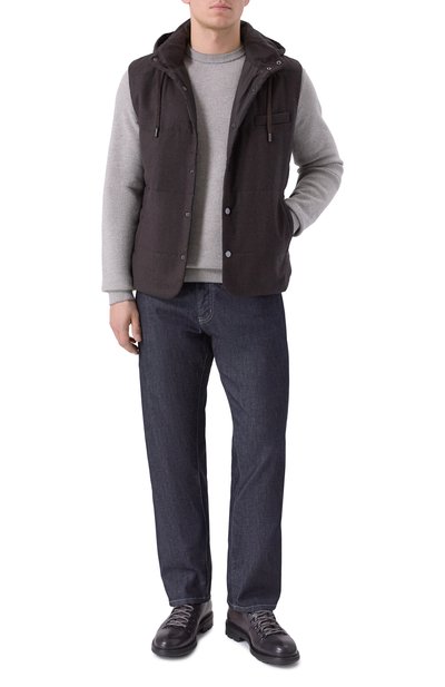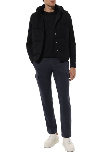 Полочку и съемный капюшон стеганого жилета выполнили из фланели на основе мериносовой шерсти, а спинку и подклад – из ветронепроницаемого полиэстера. Модель на переработанном синтетическом утеплителе, дополненная прорезными нагрудным и боковыми карманами, застегивается кнопками.
