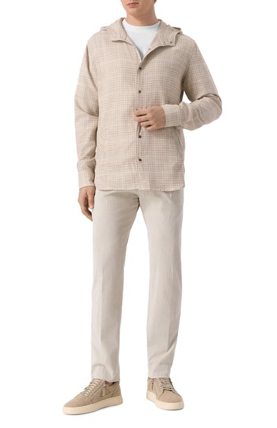 Брюки с переходящими в отутюженные стрелки защипами выполнили из микса шерсти и кашемира, произведенного на мануфактуре Loro Piana. Меланжевую модель с поясом-кулиской дополнили четырьмя карманами.