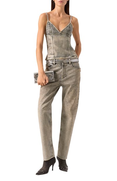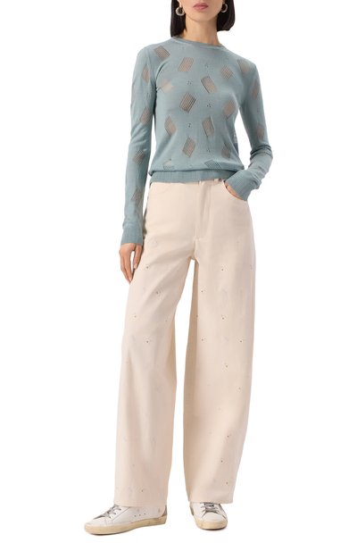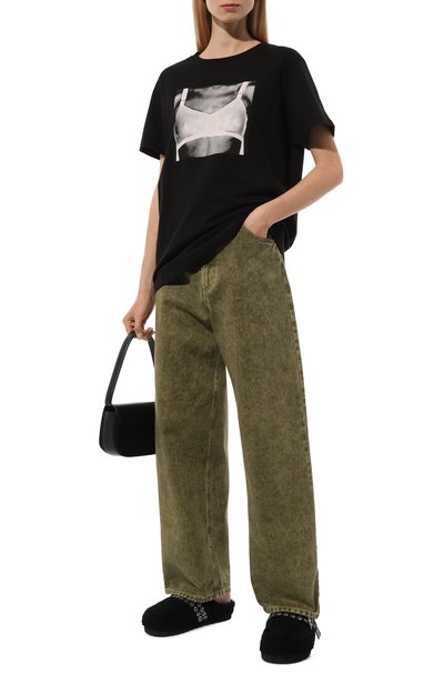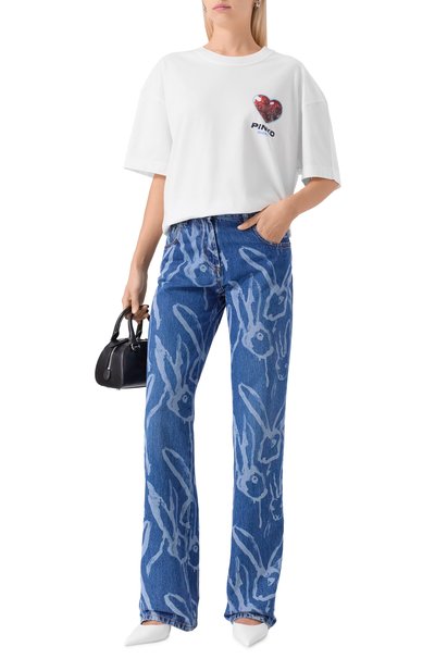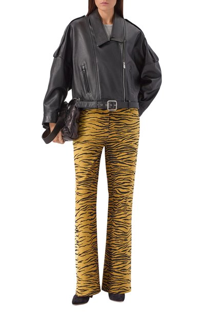Широкие джинсы с анималистичным принтом выполнили из ткани на основе вторичного хлопка с добавлением вискозы и переработанного полиэстера. Модель с пятью карманами декорировали брендированным патчем на поясе сзади.