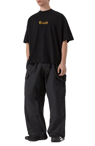 Футболку свободного кроя выполнили из хлопкового джерси. Спереди и на спинке модель, словно немного выцветшую со временем, декорировали вышитыми логотипами марки.