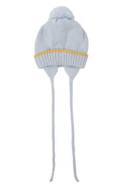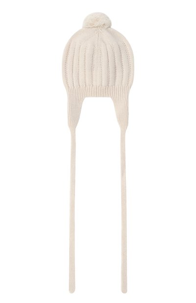 Шапку с длинными шнурами связали из кашемировой пряжи. Облегающий головной убор с манжетами и наушниками в рубчик украсили рельефными узорами-косами.