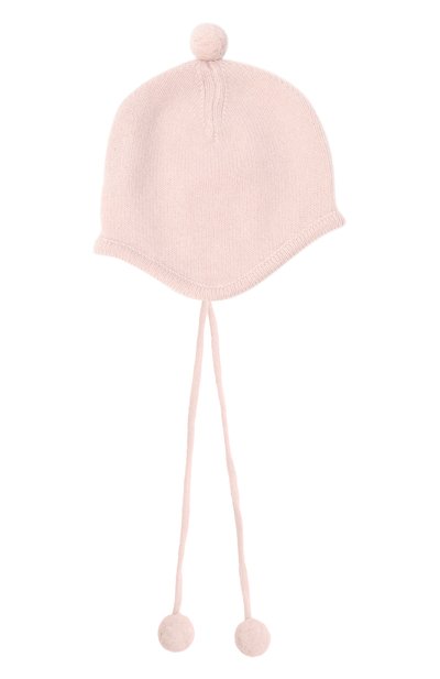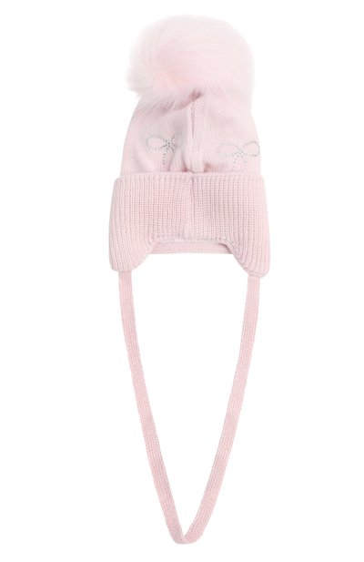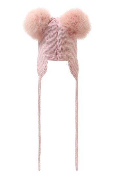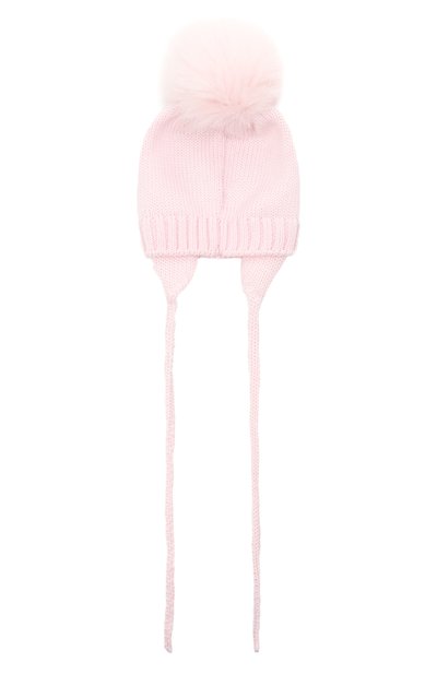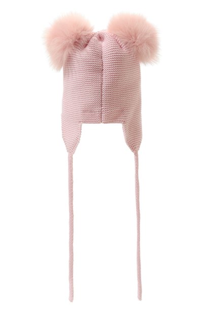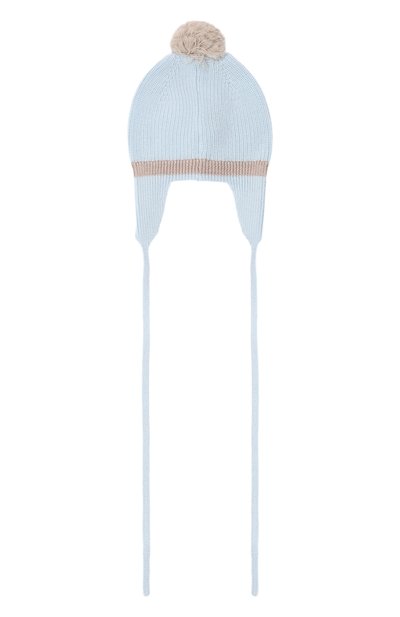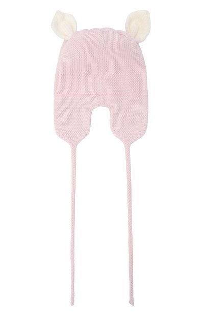 Шапку с завязками на эластичных боковых панелях связали из шерстяной пряжи. Спереди головной убор украсили вышитым цветком.
