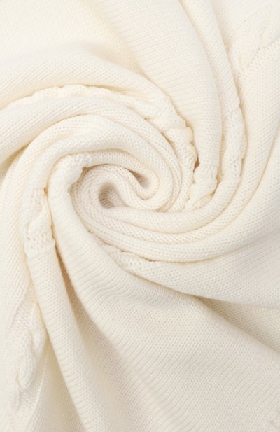 Одеяло с фактурным геометрическим узором на верхней стороне связали из мягкой шерсти. Края изделия отделали фестонами ручной работы.