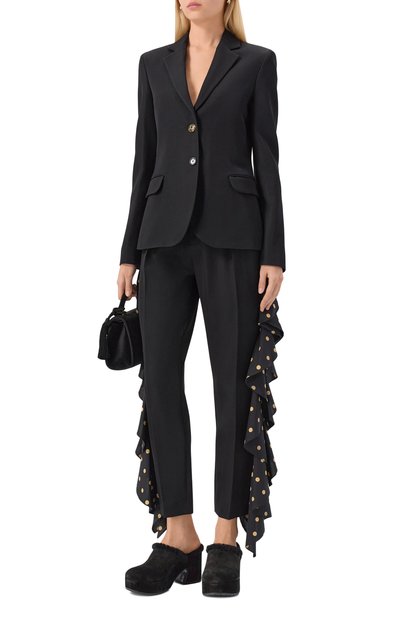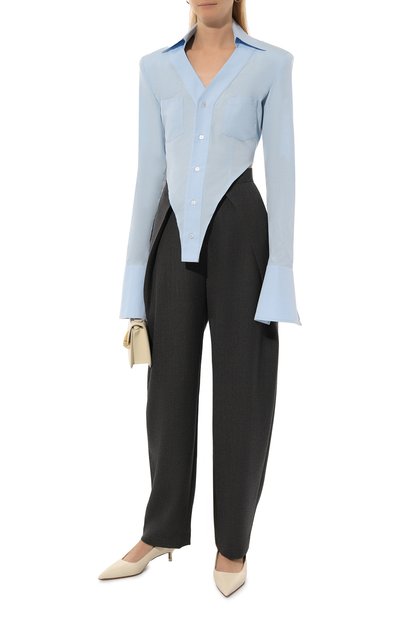 Выбеленные брюки с регулируемым поясом-кулиской выполнили из хлопкового трикотажа с добавлением полиэстера. Из такого же материала с необработанным краем изготовили съемную накладку с петлей и листочкой сзади, украшенную фи рменной эмблемой.