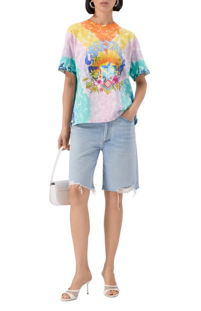 Укороченную футболку выполнили из хлопкового трикотажа, украсив спереди и сзади принтом с изображением картины Пьера-Огюста Кота "Шторм". Сзади на облегающей модели предусмотрели нашивку-петлю.