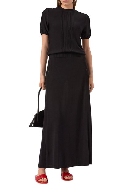 Слегка расклешенную юб ку с эластичным поясом выполнили из стрейчевого полиэстера. Модель дополнит образ с вещами и светлой, и темной гаммы.