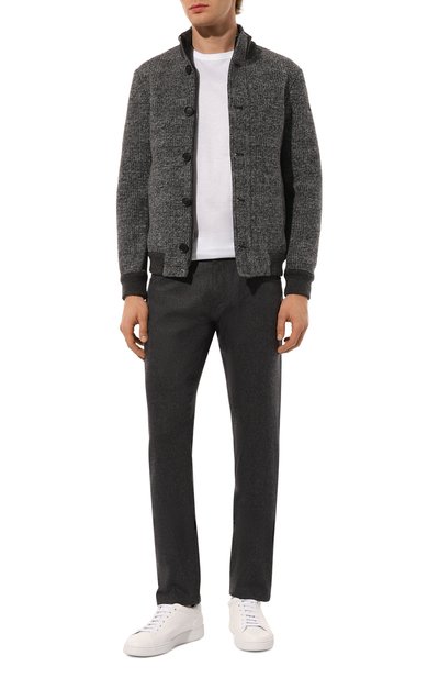 Бомбер с вязаными поясом, воротом и манжетами в полоску выполнили из буклированного полушерстяного текстиля с добавлением нейлона и шелка. Модель с боковыми карманами и еще одним нарукавным, украшенным брендированной пластиной, застегивается молнией и фигурным ремешком с кнопкой.